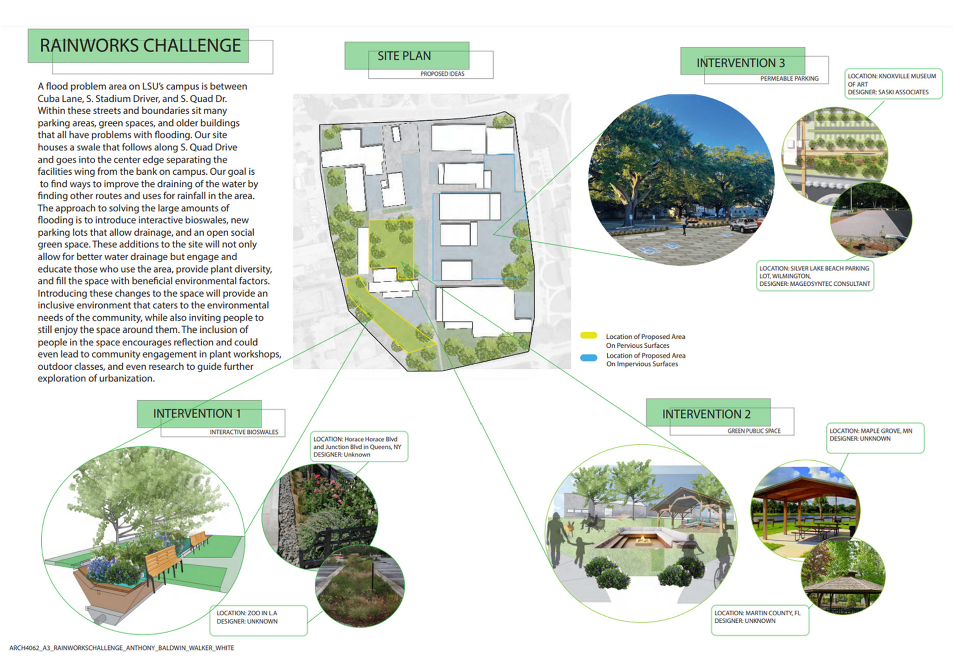 This project explored ways that green infrastructure features helped lessen environmental impacts while also improving daily life on the chosen part of campus.
